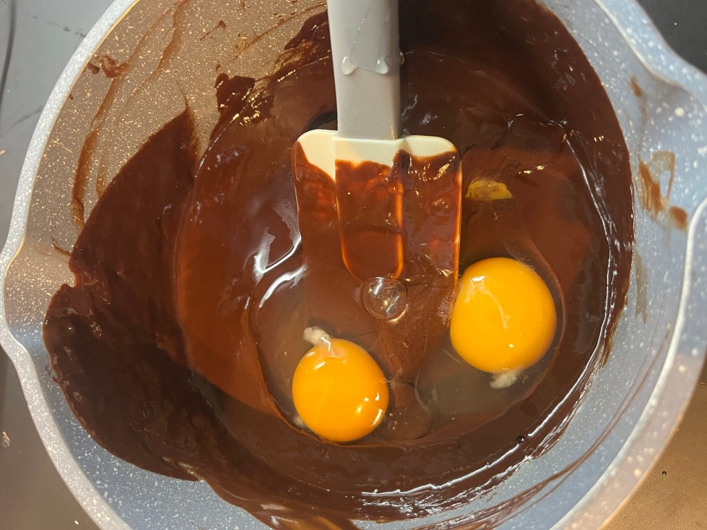 Quand le chocolat et le beurre ont fondu, ajoute les 3 Ćufs et mĂ©lange vigoureusement. Il est important que le chocolat ne soit pas chaud, sinon les Ćufs vont cuire. Si tu penses que câest trop chaud, laisse dâabord tiĂ©dir.