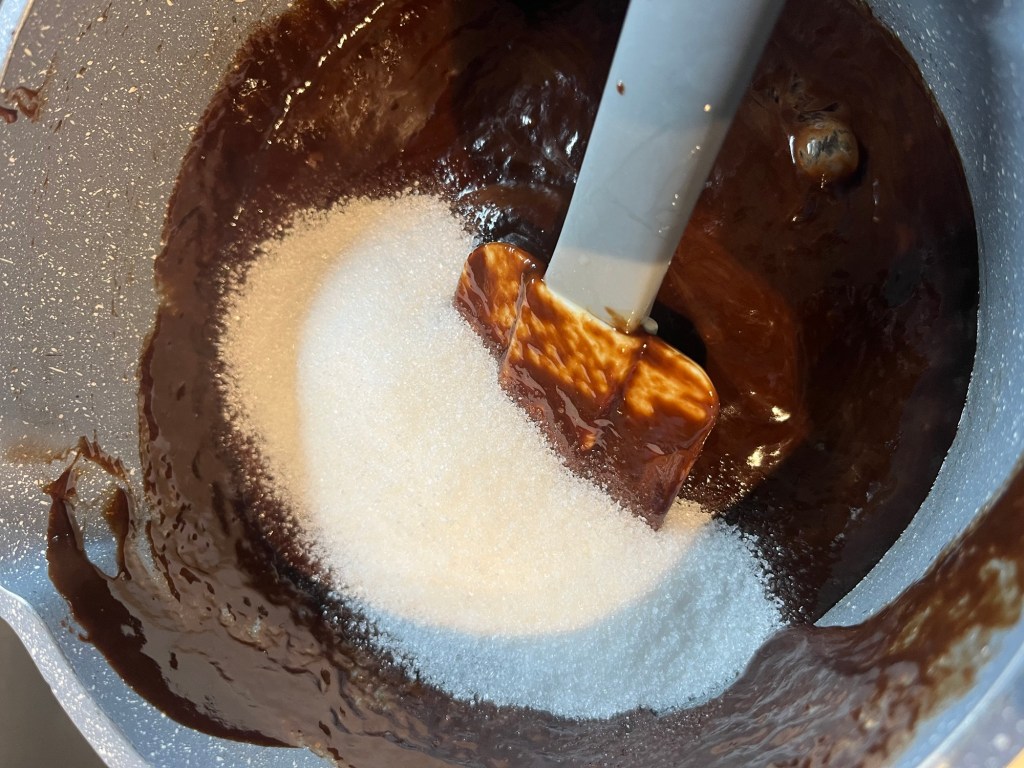 Ajoute ensuite le sucre selon ta convenance, entre 50 g et 80 g. Comme tu vas ajouter du chocolat au lait et du chocolat blanc, cela va sucrer la préparation, tu peux donc réduire ici sans problÚme.