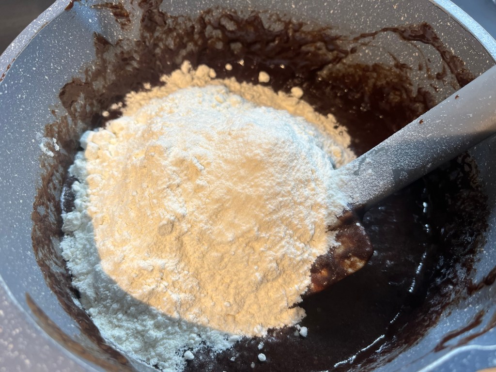 Ajoute ensuite la farine et la levure. Attention à ne pas trop mélanger : plus tu travailles la farine, plus le gluten se développe et rend le brownie trop consistant.
